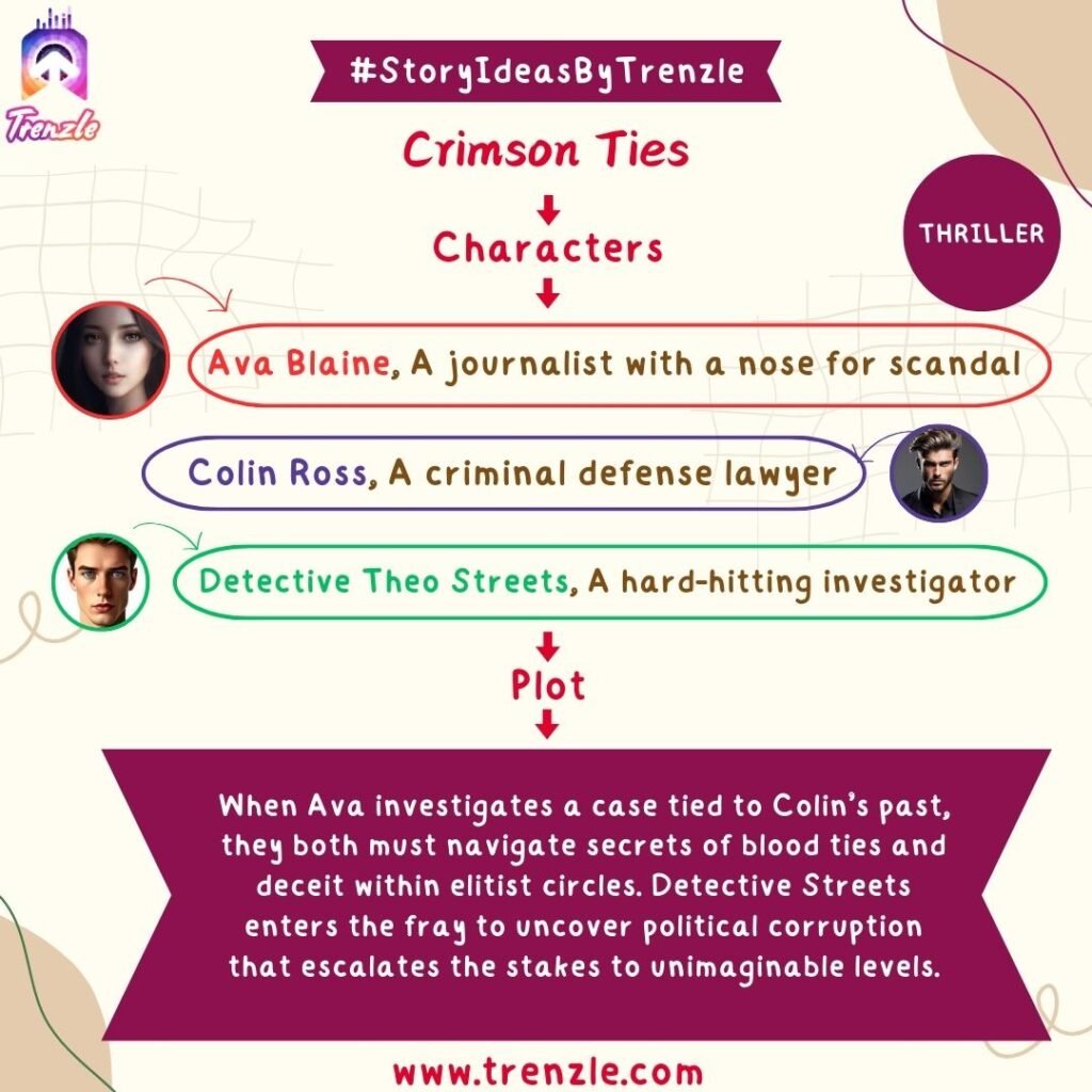 Main Characters: Ava Blaine– A journalist with a nose for scandal; Colin Ross– A criminal defense lawyer; Detective Theo Streets– A hard-hitting investigator.