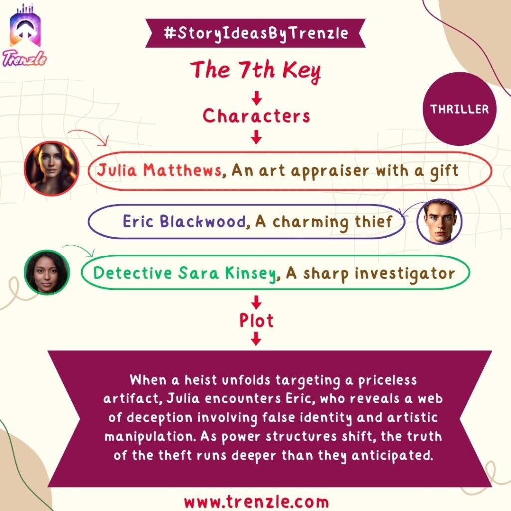 Main Characters: Julia Matthews– An art appraiser with a gift; Eric Blackwood– A charming thief; Detective Sara Kinsey– A sharp investigator.