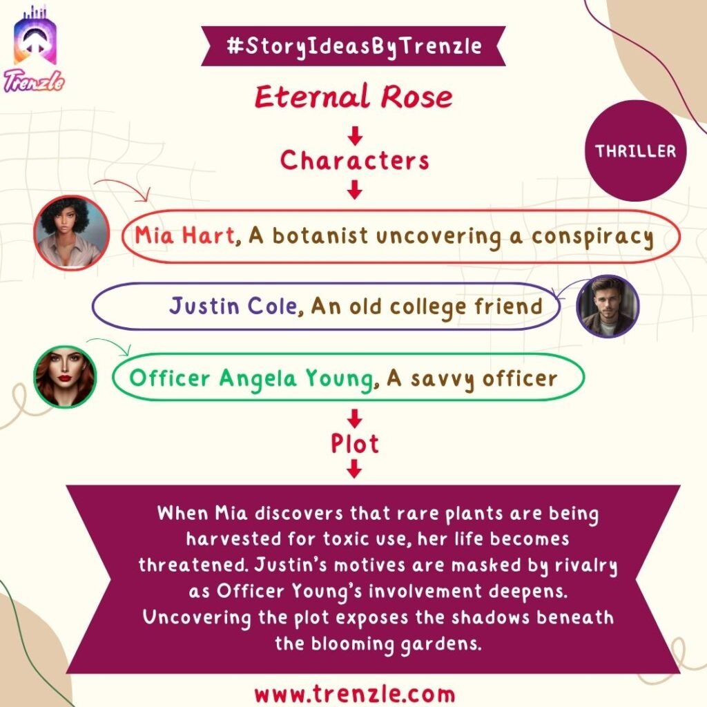 Main Characters: Mia Hart– A botanist uncovering a conspiracy; Justin Cole– An old college friend; Officer Angela Young– A savvy officer.