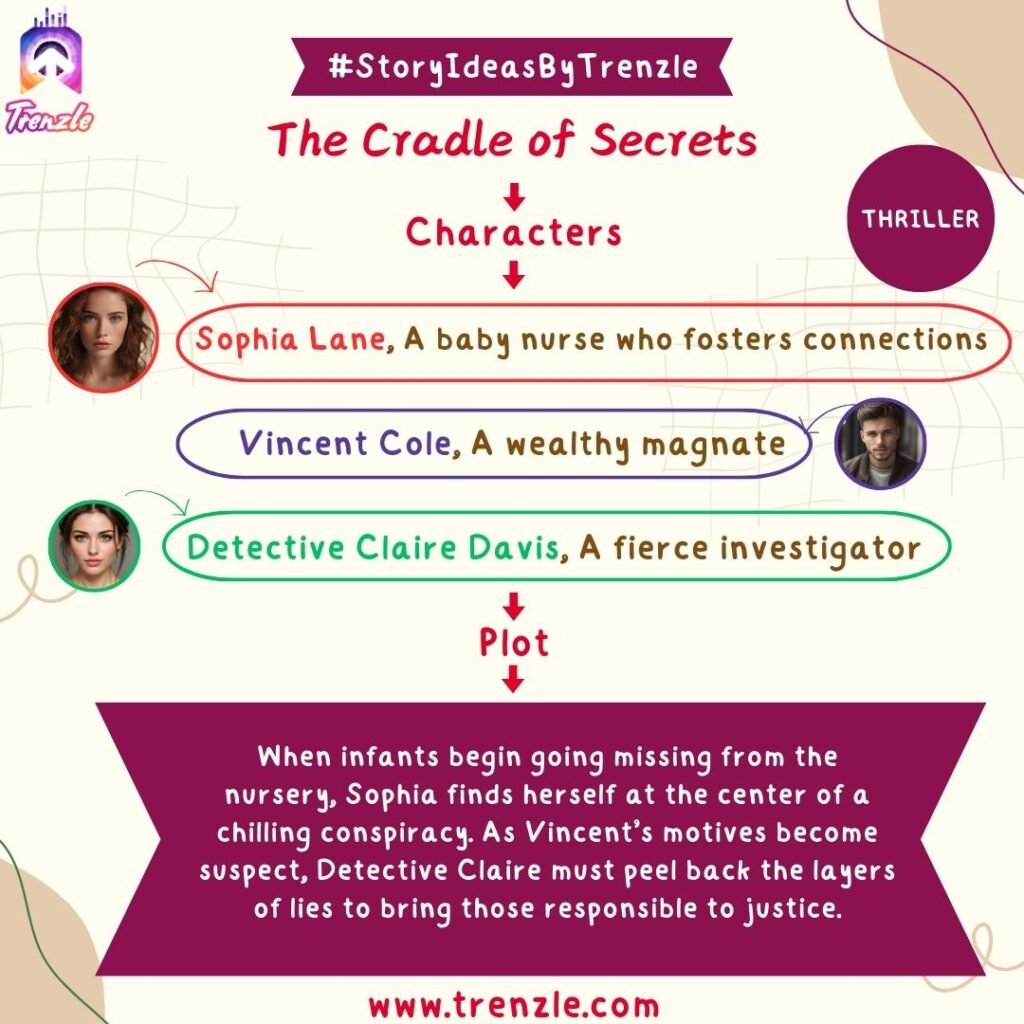 Main Characters: Sophia Lane– A baby nurse who fosters connections; Vincent Cole– A wealthy magnate; Detective Claire Davis– A fierce investigator.