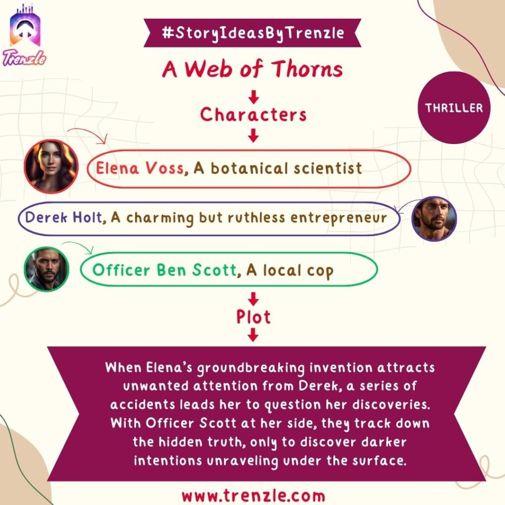 Main Characters: Elena Voss– A botanical scientist; Derek Holt– A charming but ruthless entrepreneur; Officer Ben Scott– A local cop.