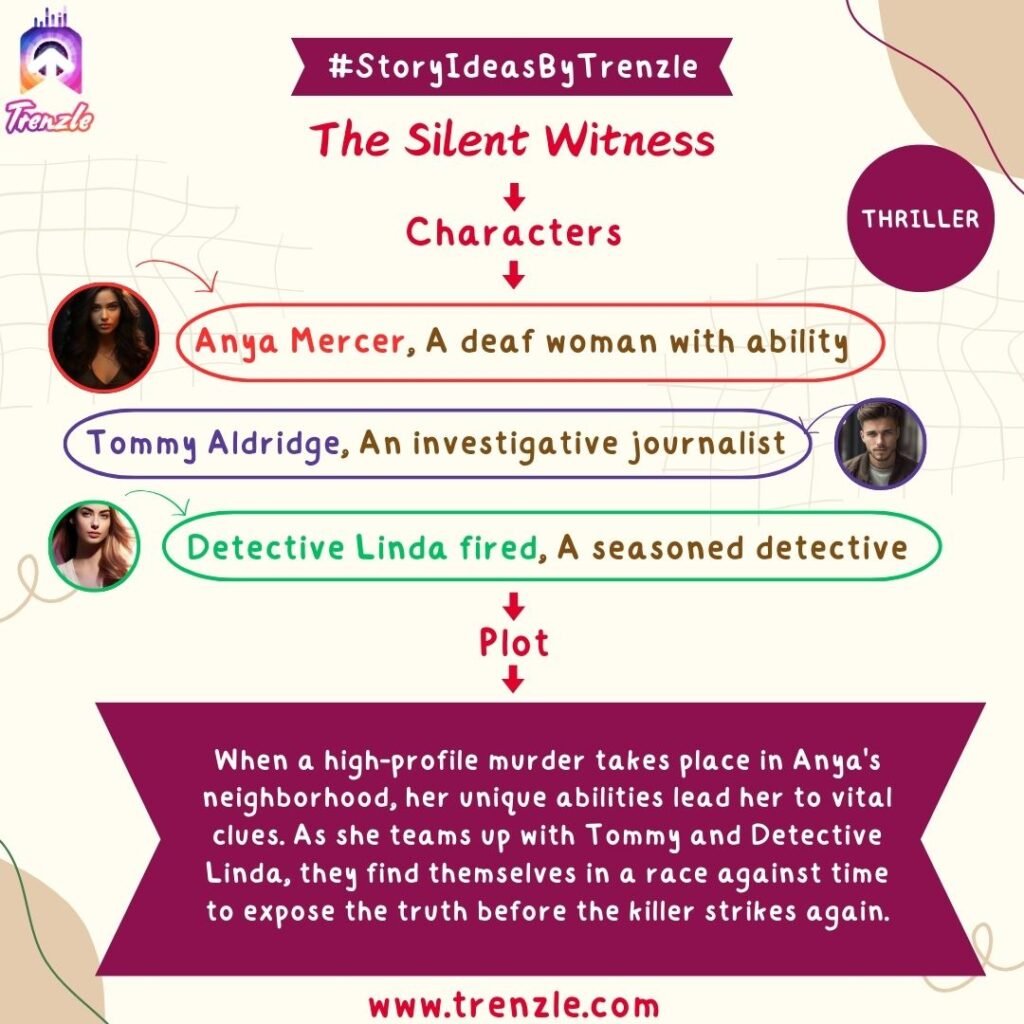 Main Characters: Anya Mercer– A deaf woman with ability; Tommy Aldridge– An investigative journalist; Detective Linda fired– A seasoned detective.