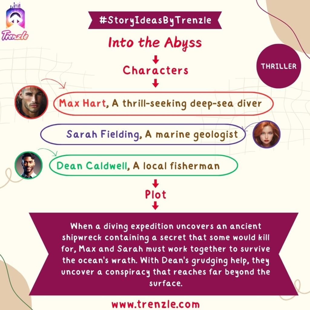Main Characters: Max Hart– A thrill-seeking deep-sea diver; Sarah Fielding– A marine geologist; Dean Caldwell– A local fisherman.