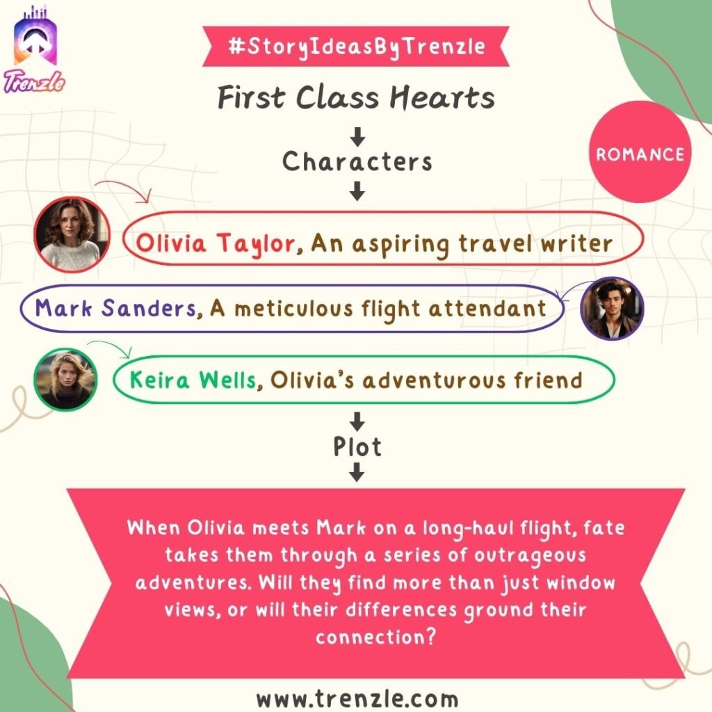 Main Characters:Olivia Taylor– An aspiring travel writer; Mark Sanders– A meticulous flight attendant; Keira Wells– Olivia’s adventurous friend.