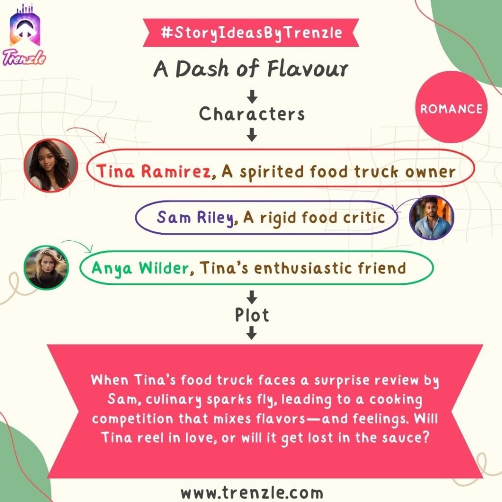 Main Characters:Tina Ramirez– A spirited food truck owner; Sam Riley– A rigid food critic; Anya Wilder– Tina’s enthusiastic friend.