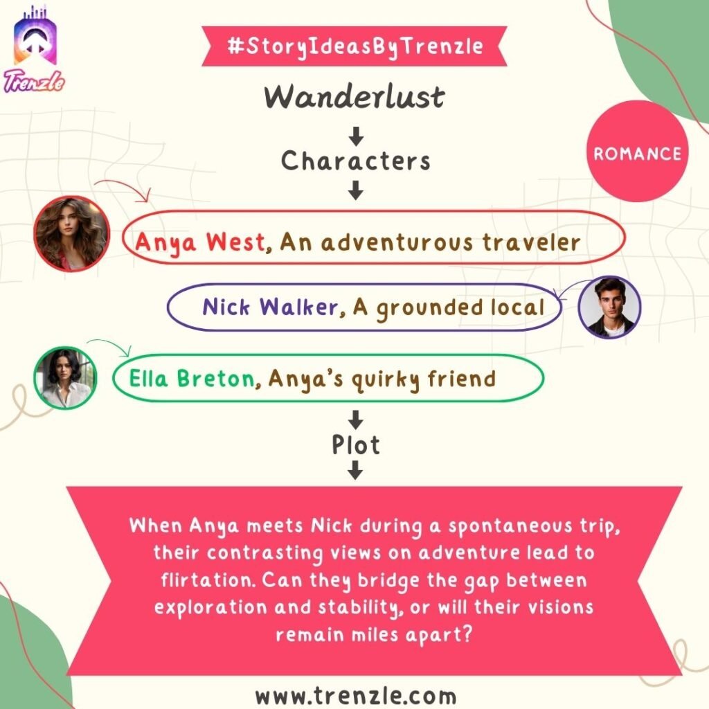 Main Characters:Anya West– An adventurous traveler; Nick Walker– A grounded local; Ella Breton– Anya’s quirky friend.