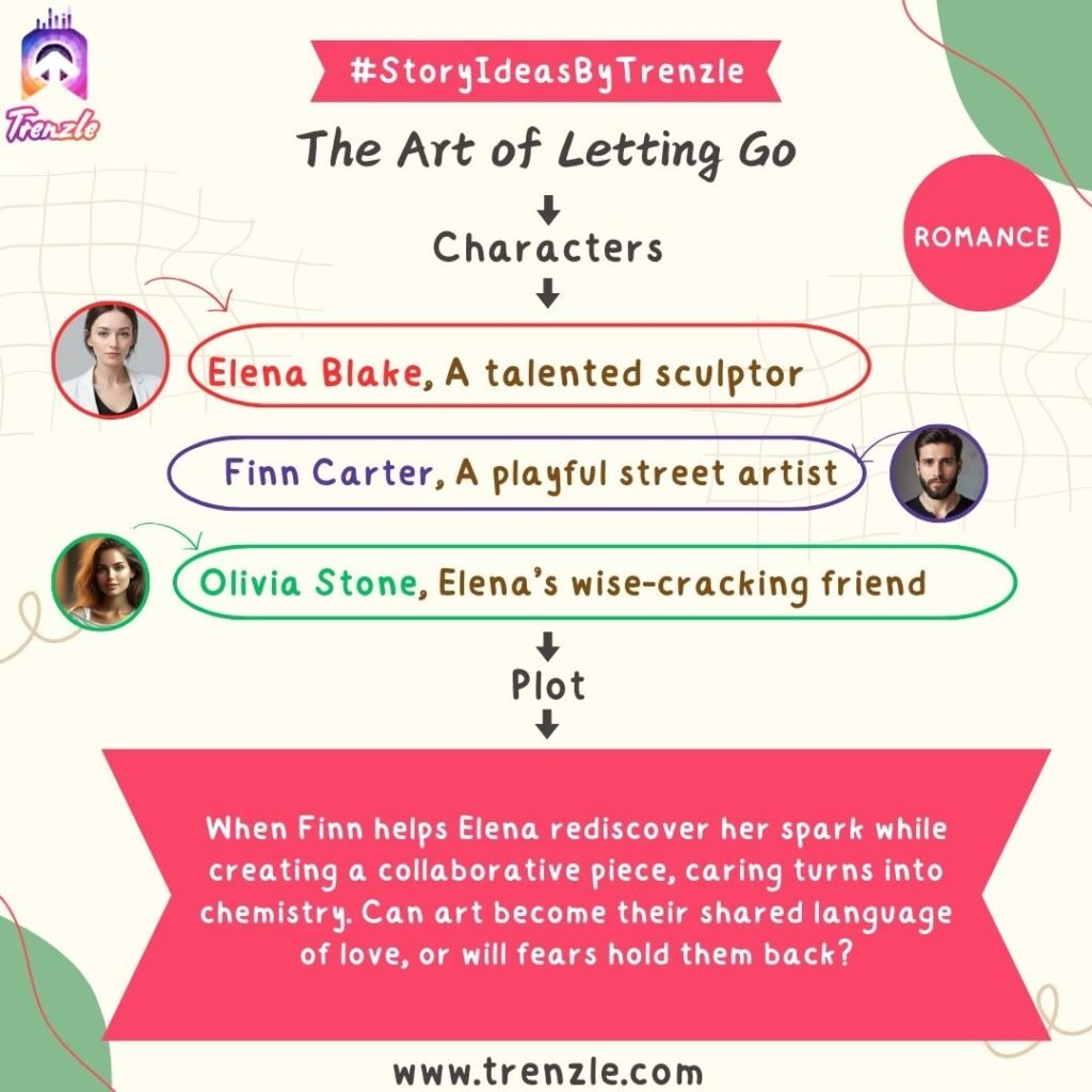 Main Characters:Elena Blake– A talented sculptor; Finn Carter– A playful street artist; Olivia Stone– Elena’s wise-cracking friend.