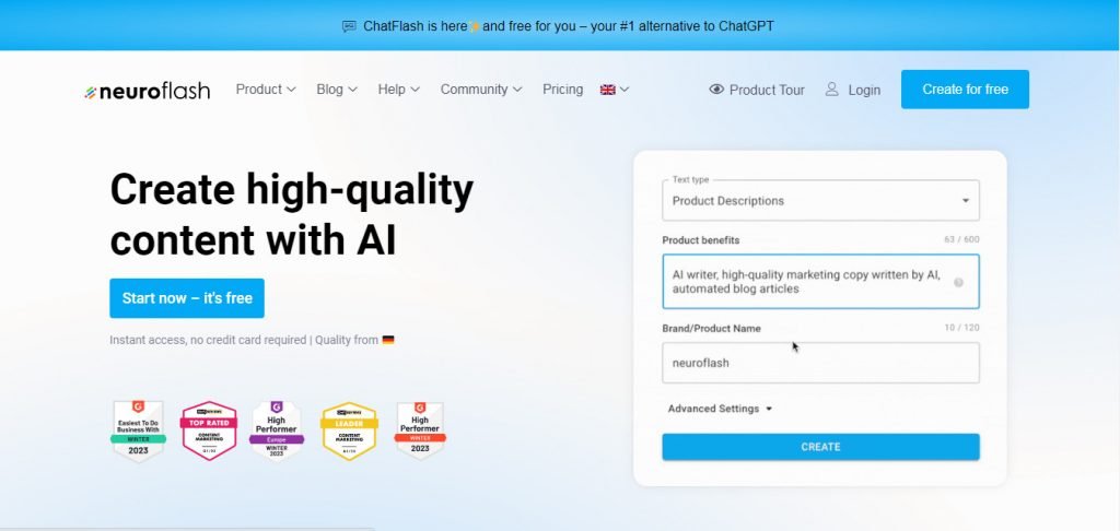 The company is based in Hamburg, Germany, and when compared to other tools, it has one of the top AI writers for creating marketing material in both German and English. Despite the fact that many AI writers are also available in German, Neuroflash has made a name for itself as a tool specifically designed for writing content for German-speaking users.