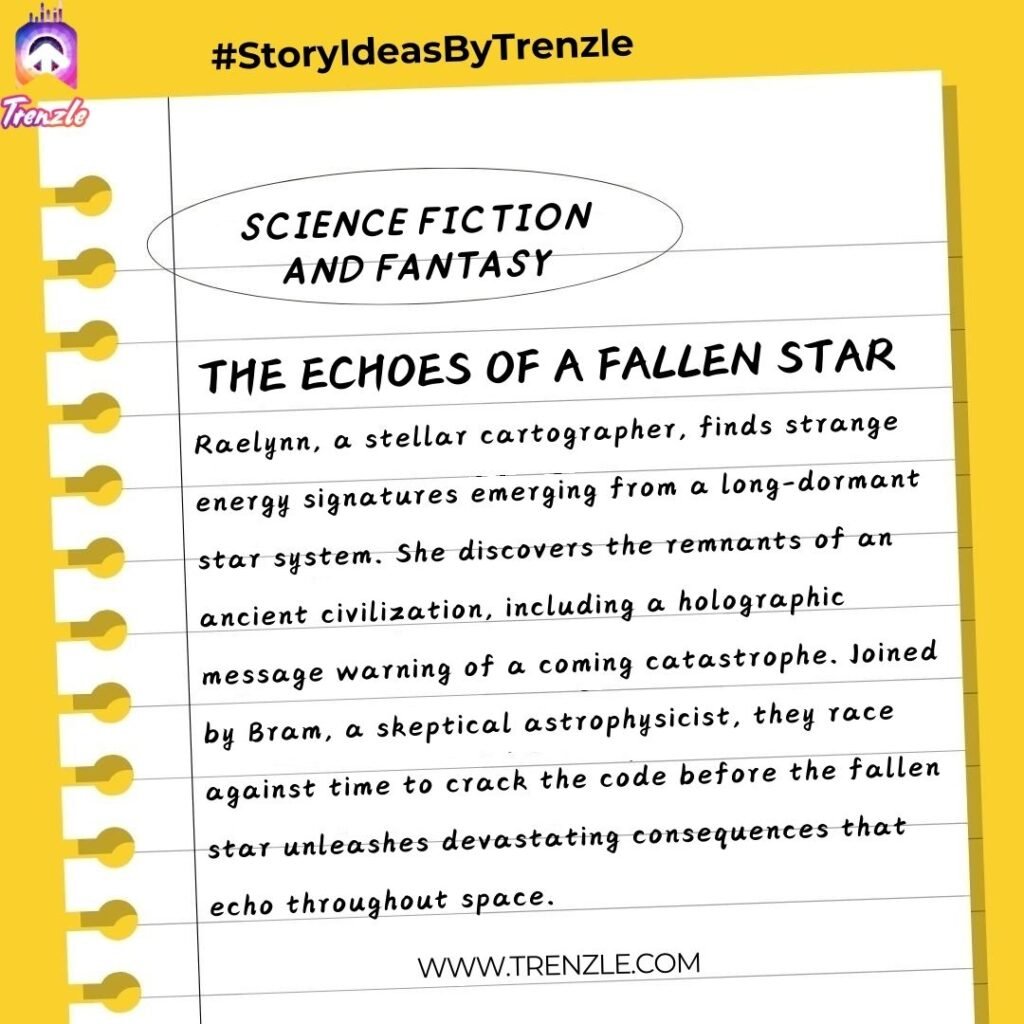 Raelynn, a stellar cartographer, finds strange energy signatures emerging from a long-dormant star system. She discovers the remnants of an ancient civilization, including a holographic message warning of a coming catastrophe. Joined by Bram, a skeptical astrophysicist, they race against time to crack the code before the fallen star unleashes devastating consequences that echo throughout space.